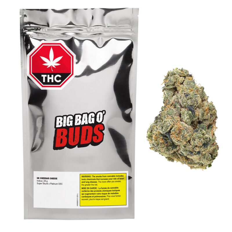 UK Cheddar Cheese from Big Bag O’ Buds is a high‑potency, indica‑dominant bulk flower crafted by Organigram, celebrated for its unmistakably pungent “old‑school” cheese aroma and strong physical effects. Offered in a value‑priced 28 g format, this cultivar is a favourite among experienced users seeking heavy relaxation, dense trichome‑covered buds, and a classic skunky‑cheese terpene profile in a large‑format bag.