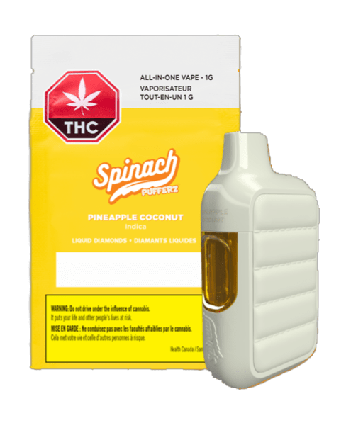 Grab a sweet, creamy, poolside treat that you can’t resist with the Spinach PUFFERZ™ Pineapple Coconut all-in-one vape. Grab your shades and chill out at the cabana with a smile on your face after that first puff. Inspired by a strain with a LA Kush CK and Coco Milk lineage, enjoy hints of vanilla, citrus and a whipped-up potency with liquid diamonds at 98.1% THC.