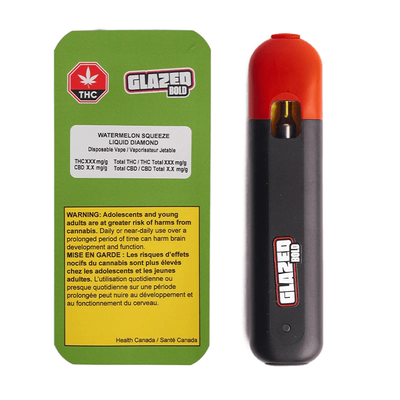 BOLD GLAZED Watermelon Squeeze Liquid Diamond vape combines high potency Liquid Diamonds with sweet, juicy watermelon. The perfect blend of watermelon and sugar. This rechargeable all-in-one disposable vape, contains smooth, extra high levels of THC with caryophyllene, limonene, and linalool. The BOLD option for when distillate vapes aren’t enough.