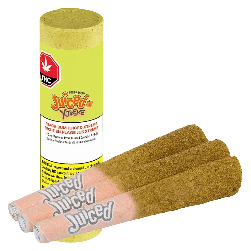 Peach Bum Juiced Xtreme resin infused pre-rolls have a robust, high quality and full spectrum resin infusion with high THC. They’re juicy with peach, fruity and sweet flavours and their new kief coating.