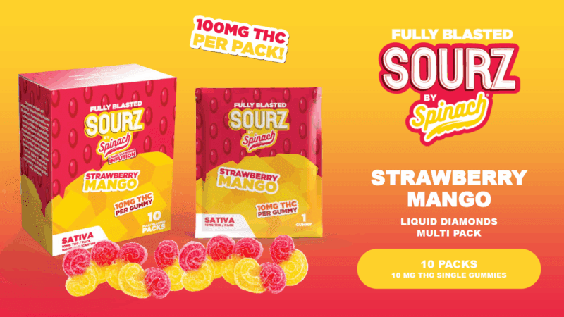 Experience a zesty fusion of strawberry and mango in SOURZ by Spinach® Fully Blasted gummies, each infused with 10mg THC for balanced euphoria. These sour, soft chews deliver a flavorful, uplifting hybrid effect perfect for cannabis enthusiasts seeking tasty, potent edibles.