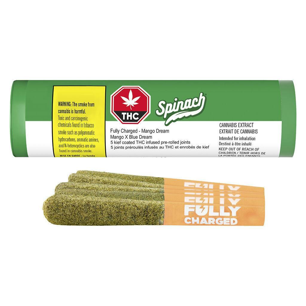 Float in a cloud made of juicy mango flavour notes and let your daydreams fuel this ride. The Spinach® Fully Charged Mango Dream infused pre-roll is bursting with tropical and succulent mango flavour notes, creating a taste experience that’ll remind you that dreams can become reality. Inspired by a strain that traces its lineage back to Mango and Blue Dream cultivars, enjoy blissful flavours and high potency at 40%+ Total THC thanks to the infusion of high-quality, high-potency cannabis extract with a kief coating.