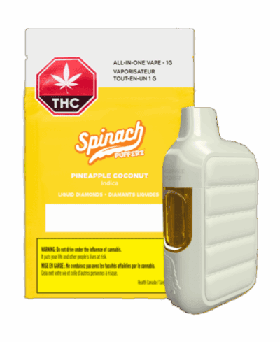 Grab a sweet, creamy, poolside treat that you can’t resist with the Spinach PUFFERZ™ Pineapple Coconut all-in-one vape. Grab your shades and chill out at the cabana with a smile on your face after that first puff. Inspired by a strain with a LA Kush CK and Coco Milk lineage, enjoy hints of vanilla, citrus and a whipped-up potency with liquid diamonds at 98.1% THC.