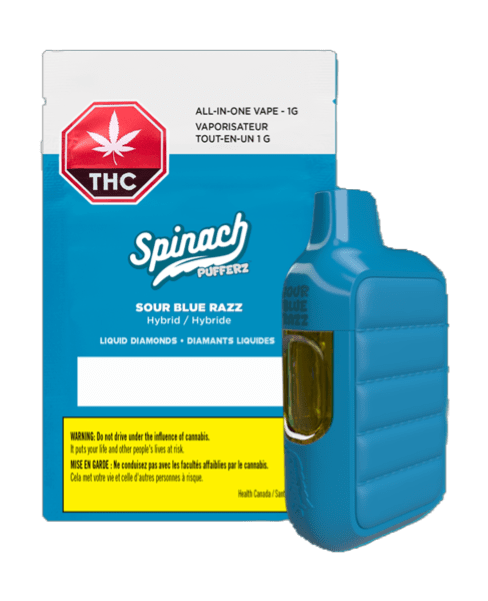 Your tastebuds will rejoice as you take a hit of the Spinach PUFFERZ™ Sour Blue Razz all-in-one vape. Juicy blasts of blue raspberry flavour notes come through on that first hit, making for a memorable and familiar taste experience. Let those fruity flavour notes and aromas fill the air thanks to inspiration by a strain with a Blue CKS and Mendobreath lineage. Sour and fruity flavours plus the pure gas potency at 98.1% THC thanks to liquid diamonds, equals one awesome puff.