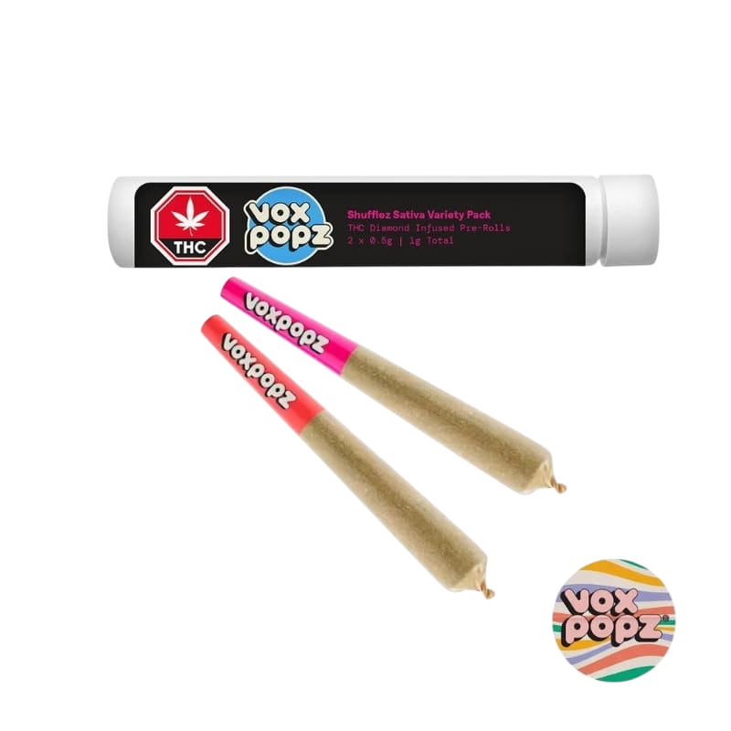 Vox Shufflez keeps dropping fresh hits. With two rotating flavours in every pack, these sativa diamond-infused crushable pre-rolls crank it up to 40% THC! Talk to your budtender to confirm which flavours are available in your region!
