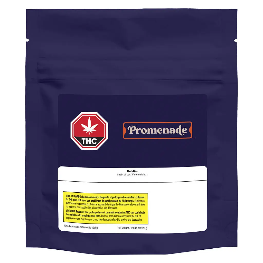 Promenade Buddies (28g) is a high‑value hybrid ounce featuring petite buds selected for potency, flavour, and affordability. As a rotational product, the strain inside can vary between batches—common rotations have included Pink God and Biscotti Mints—but all are chosen for strong THC and reliable hybrid effects.